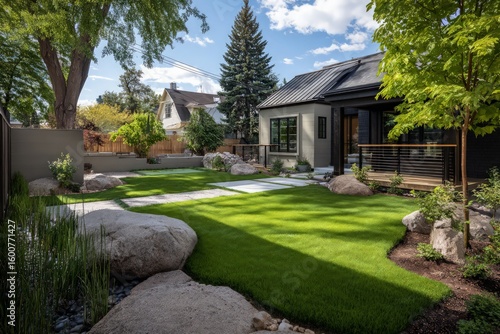 garden, landscaping, yard, house, home, property, exterior, modern, contemporary, design, tree, grass, plant, stone, gravel, patio, deck, residential, landscape, nature, lawn, japanese, zen, garden design, rock, shrub, foliage, sunlight, shadow, architecture, backyard