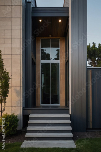 Modern house entrance with beige stone siding, dark gray metal accents, and a recessed wooden-framed glass door. Concrete steps lead up to a small porch. Landscaping is minimal.
