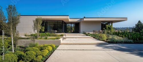 house, modern, home, architecture, exterior, building, contemporary, design, landscape, yard, garden, step, driveway, concrete, plant, tree, shrub, grass, landscaping, sunlight, day, summer, residential, property, real estate, style, minimalist, elegant, luxury, facades, entranceway, pathway, paseo, serene, tranquil, outdoors, nature