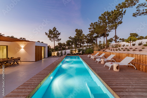 Modern house with garden swimming pool and wooden deck