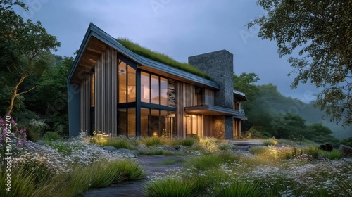 house, modern, architecture, green, roof, wood, stone, garden, tree, nature, landscape, facades, glasses, window, lighting, gloaming, serene, tranquil, cosy, residence, vegetation, plant, grass, flower, path, ambient, design, material, rustic, natural, dwelling, connection, expansive, view, light, warm, lush, diverse