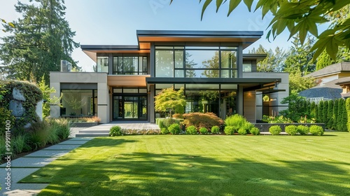 house, modern, home, window, lawn, grass, green, landscaping, exterior, architecture, design, contemporary, style, residential, property, luxury, backyard, garden, tree, bush, sky, sunny, day, summer, patio, paseo, stone, path, sunlight, shadow, bright, vibrant, leaf, foliage, nature