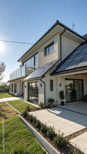 solar, panel, house, exterior, energy, architecture, modern, home, design, residential, building, roof, patio, landscaping, garden, grass, window, glasses, balcony, view, sun, light, bright, sunny, green, concrete, path, paseo, plant, shrub, tree, structure, luxury, contemporary, estate, renewable, power, efficiency, environment, sustainable, living, day, property, real, investment, clean