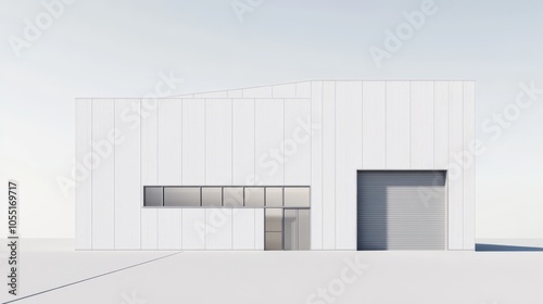 Modern Industrial Architecture: Clean lines and minimalist design characterize this sleek, modern warehouse building, with a large garage door and a glass-paned entrance.