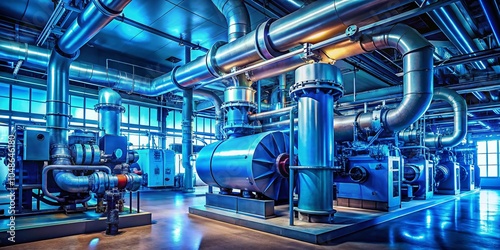 Modern Industrial Boiler Room with Rankine Organic Cycle Turbine and Control Cabinets for Heating Process in Blue