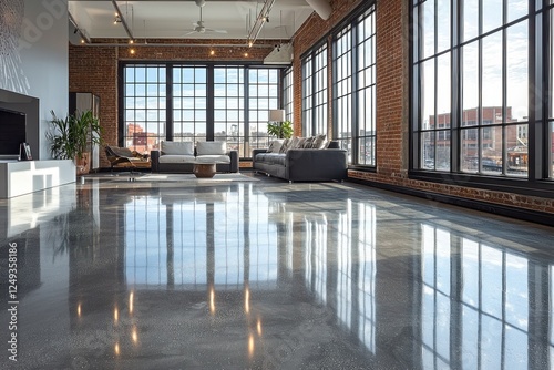Modern industrial loft interior with large windows, stylish furniture, and polished floor