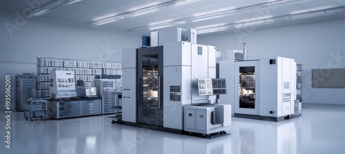 Modern industrial production equipment is located in a high-tech cleanroom facility. White CNC machines feature digital displays and automated tools.