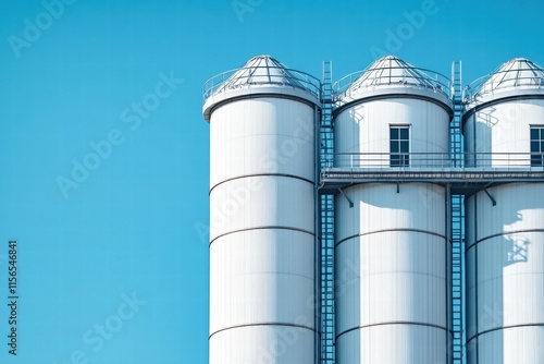 silos, industrial, storage, tank, metal, white, blue skies, clear sky, day, sunlight, architecture, building, exterior, industrial building, factory, agriculture, grain, infrastructure, technology, elevation, vertical, line, modern, contemporary, structure, geometric