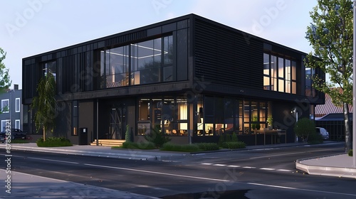 Modern industrial-style suburban house with a black exterior, urban street setting, mid-morning,