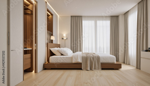 Modern interior design architecture photography: This architectural visualization showcases a modern bedroom featuring warm wood tones, neutral fabrics, and soft lighting, creating a serene and mini