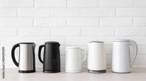 Modern kitchen appliance collection featuring various electric kettle designs in white and black. clean, organized household assortment in row
