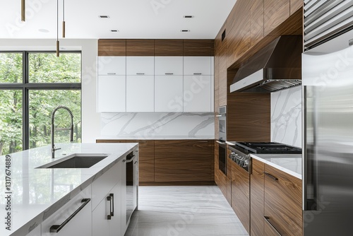 kitchen, modern, interior, design, marble, wood, cabinet, island, sink, faucet, countertop, appliance, stainless, steel, oven, stove, range, hood, window, light, home, decor, contemporary, architecture, style, elegant, luxury, minimalist, clean, white, brown, floor, indoor, residence, real, estate, property, building, house, furniture, domestic, room, space, surface, construction, renovation, upgrade, improvement, open