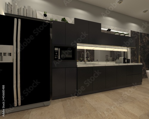modern kitchen interior in industrial style with dark gray cabinet and standing refrigerator