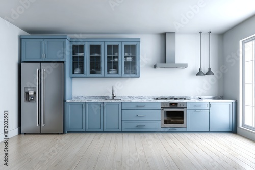 kitchen, modern, blue, cabinet, appliance, refrigerator, oven, stove, range, hood, sink, faucet, countertop, marble, backsplash, contemporary, interior, home, house, dwelling, residential, renovation, design, clean, bright, roomy, room, domestic, cooking, food, preparation, dining, lifestyle, comfort, furniture, arrangement, flooring, wooden, light, minimalist, aesthetic, efficiency, functional, utility, area, building, structure, architecture