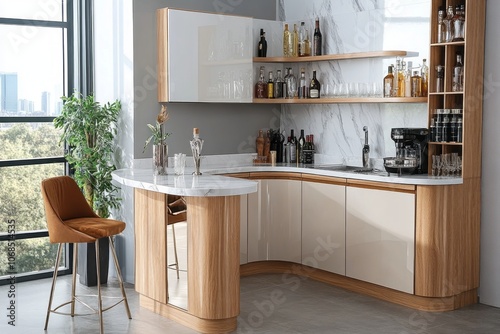 Modern Kitchenette with Curved Bar Counter and Glassware
