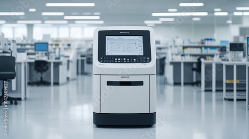 Modern laboratory equipment on a clean white background with advanced interface, showcasing innovation in science.