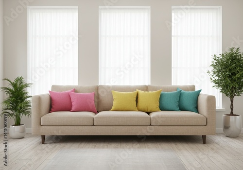 Modern living room featuring a beige sofa adorned with colorful cushions near large windows with sheer curtains and indoor plants in bright, spacious setting