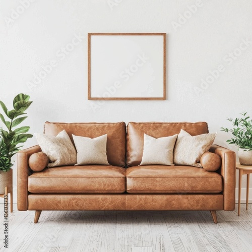Modern Living Room with Stylish Leather Sofa and Blank Canvas Frame