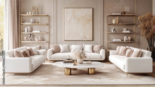 Modern Living Room with White Sofas, Gold Accents, and Beige Rug