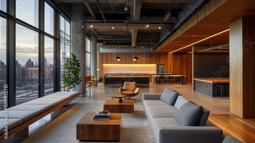 Modern Lounge Area with City View and Wooden Accents