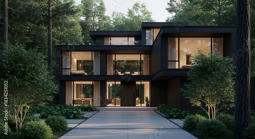 Modern Luxury Home Exterior with Large Windows Surrounded by Lush Green Trees and a Paved Driveway in a Forest Setting