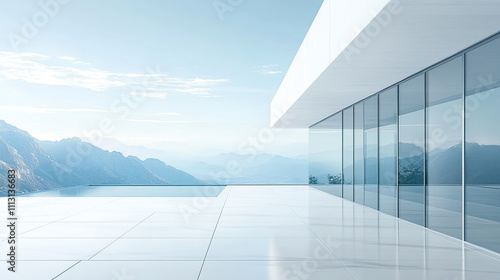 Modern minimalist architecture with glass windows overlooking the distant mountains