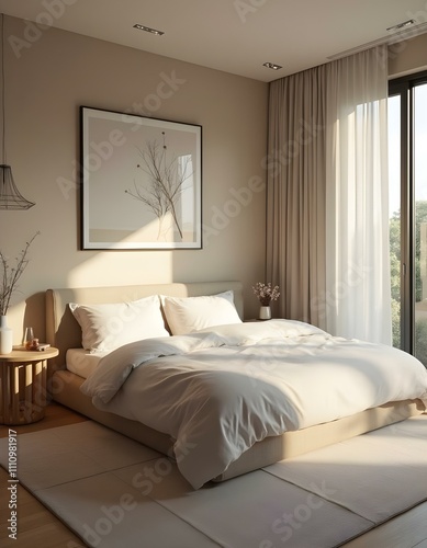 Modern minimalist bedroom interior design with sunlight illuminating comfortable bed