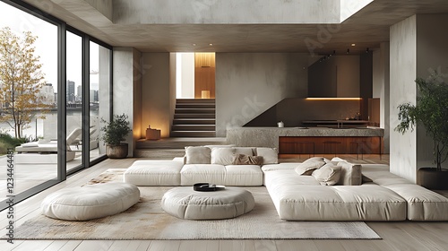 apartment, architecture, contemporary, design, home, house, interior, living, modern, room, space, style, urban, villa, building, concrete, couch, cushion, decor, floor, furniture, glasses, kitchen, light, luxury, minimalist, open, plan, seating, stair, sun, view, wall, window, wood
