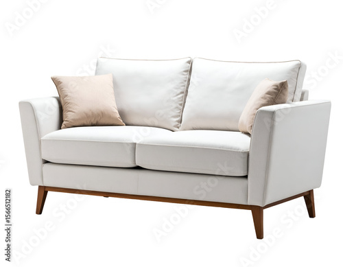 modern, minimalist, sofa, loveseat, cushion, furniture, home, interior, living, room, comfort, comfortable, design, elegant, stylish, cosy, plush, pillow, fabric, textile, cream, beige, neutral, wood, wooden, leg, domestic, house, apartment, decor, decoration, relaxation, inviting, empty, clean, studio, object, product, seating, residential, lifestyle, lounge, contemporary, upholster, accent