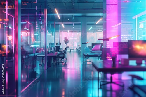 Modern neon cyberpunk open space office interior blurred with information technology overlay. Corporate strategy for finance, operations, marketing