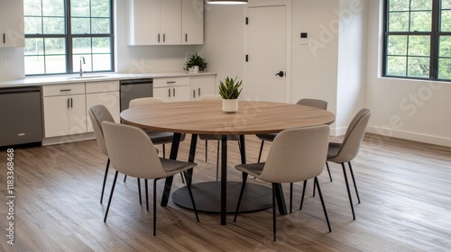 office, table, chair, modern, design, interior, workspace, collaboration, teamwork, business, meeting, kitchenette, architecture, furniture, contemporary, empty, kitchen, dining, simplicity, warmth, harmony, flooring, minimalist, relaxing, layout, living, community, atmosphere, detail, stylish, open, aesthetic, round, seating, comfort, elegant, inviting, cosy, welcoming, neutral, craftsmanship, home, light