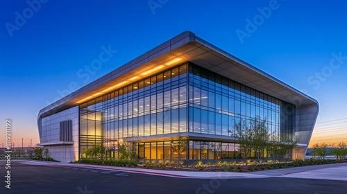 modern, building, exterior, architecture, photo, technology, infrastructure, dusk, two-story, structure, flat, roof, window, glasses, reflect, warm, glow, setting sun, concrete, design, curved, car park, entrance