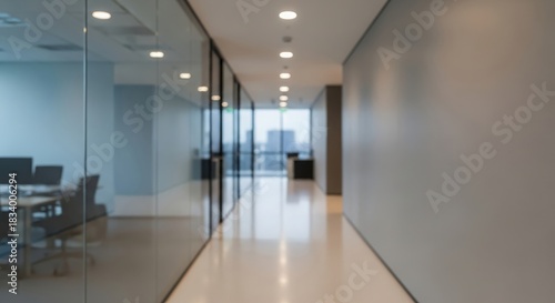 Modern Office Hallway Blur – Soft-focus corporate corridor with glass walls and clean neutral tones