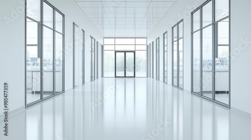Modern office hallway with glass doors, bright lighting, and a polished floor, ideal for corporate and business settings.