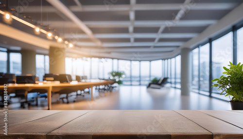 office, interior, table, wood, window, workspace, corporate, modern, design, architecture, work, business, empty, desk, professional, sunlight, city view, contemporary, minimalistic, clean, organised, roomy, bright, natural light, urban, workplace, workstation, meeting room, conference room, furniture, chair, computer, technology, plant, decor, generative, ai, illustration, room, house, home, window, apartment, kitchen, living, loft, sofa, nobody, floor