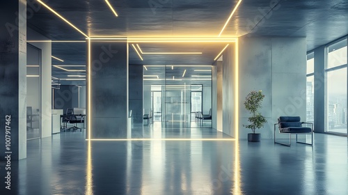 modern, office, interior, concrete, wall, wall, ceiling, line, line, glow, glowing, light, light, window, window, view, city, city landscape, skyscraper, skyscraper, glasses, floor, reflections, chair, chair, desk, desk, plant, greenery, minimalist, contemporary, sleek, elegant, workspace, design, architecture, building, urban, bright, clean, professional, business, corporate, style, roomy, open, airy
