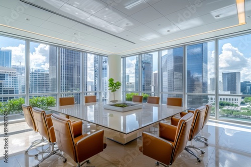 meeting room, office, office space, conference room, business, corporate, modern, contemporary, interior design, interior, architecture, city, city landscape, skyscraper, glasses, window, light, bright, roomy, professional, executive, luxury, table, chair, brown, white, clean, minimalist, furniture, office furniture, work, meeting, collaboration, teamwork