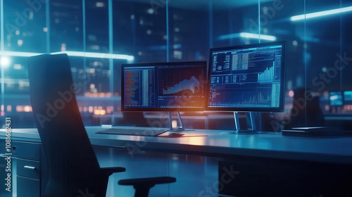 modern office workspace featuring dual monitors displaying data analytics and graphs, illuminated by city lights at night, creating high tech atmosphere