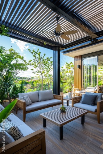 living, space, balcony, patio, furniture, modern, design, relaxation, greenery, nature, sunshine, sunlight, plant, seating, table, wood, decor, comfort, contemporary, architecture, leisure, home, stylish, fresh, summer, cosy, elegance, lifestyle, home decor, landscape, view, serene, calmness, environment, shade, ceiling, fan, cushion, arrangement, setting, inviting, bright, vibrant, open, retreat, urban, escape, peaceful