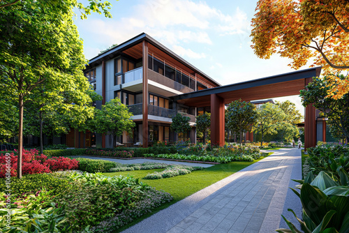 architecture, contemporary, building, design, environment, exterior, greenery, landscape, peaceful, residential, structure, urban, nature, sunlight, pathway, plant, seasonal, vibrant, space, community, residential area, blue skies, tree, flower, inviting, scenic, warm, harmony, balance, relaxation, lifestyle, serene, leisure, freshness, modernity, elegant, sustainable, aesthetic, garden, clear sky, welcoming, roomy
