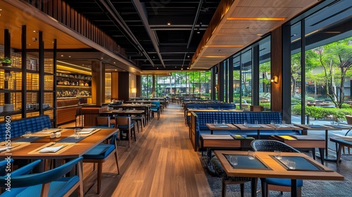 eatery, interior, modern, roomy, inviting, dining, table, chair, blue, wooden, floor, window, garden, view, light, design, luxury, decor, contemporary, comfortable, elegant, sophisticated, ambience, posh, food, drink, service, space, clean, bright, open, stylish, warm, high-end, hospitality, fine, area, comfort, seating