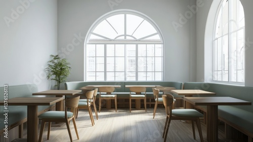 Modern Restaurant Interior with Wooden Tables, Chairs, and Large Windows