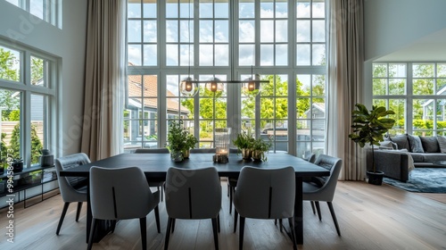 Modern Scandinavian dining space with a black oak table, high-back chairs, and oversized windows that fill the room with natural light