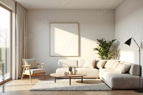 modern scandinavian living room, 3d render sunny bright interior, plaster wood texture,s minimalist design, stylish lighting cozy functional decor, realistic textures
