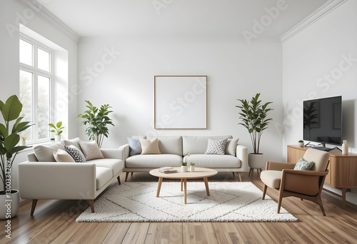 Modern Scandinavian living room with a cozy sofa, mid-century furniture, wooden floor, white walls, and home plants. Minimalist design with a warm, inviting atmosphere.