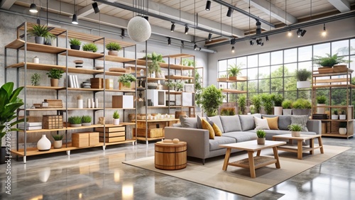 Modern Scandinavian-style furniture store interior with rows of shelves, displays, and warehouse sections filled with affordable, self-assembly home decor and furniture pieces for sale.
