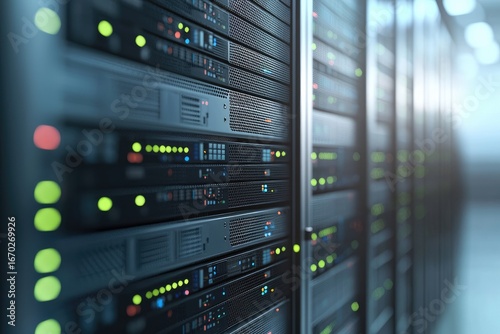 Modern server racks in a data center with green and orange indicator lights, ideal for illustrating cloud computing, IT infrastructure, networking, storage, and technology concepts
