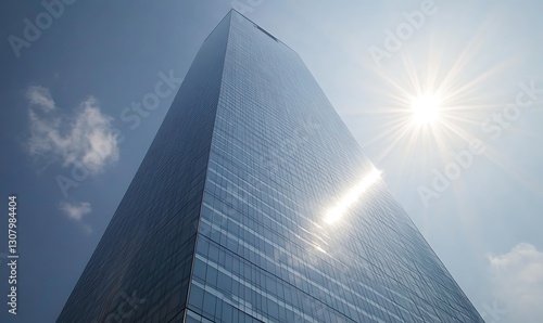Modern skyscraper under bright sunlight with a clear blue sky backdrop.