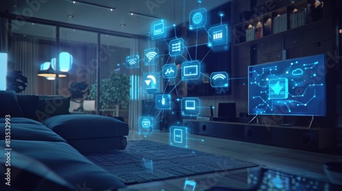 Modern smart home interior with connected device icons. Futuristic technology concept.