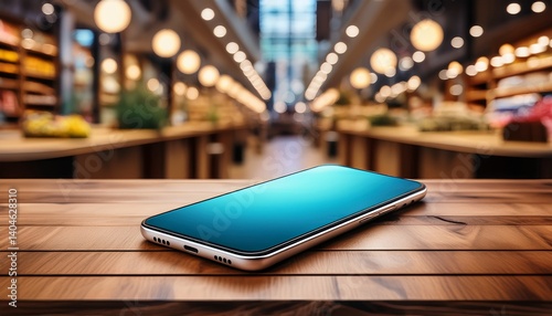 Modern smartphone displayed prominently on a wooden surface within a colorful retail environment. Generated image